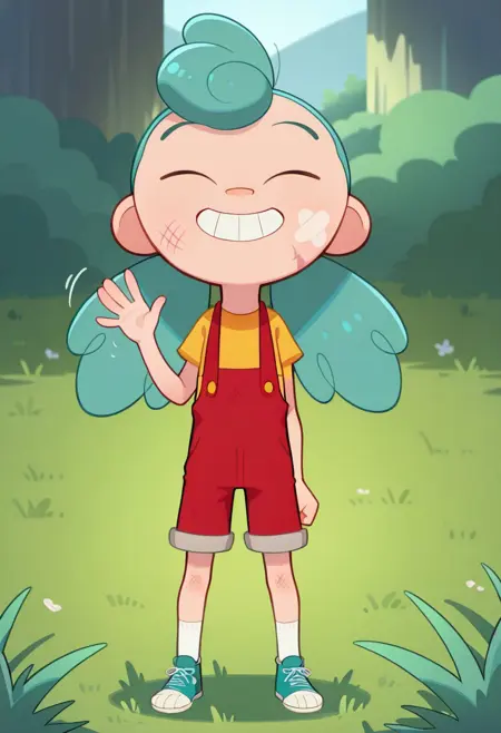 turquoise hair, long hair, two pigtails, pink eyes, two white band-aids on her left cheek, scratches on her right cheek,
