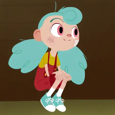 mustard yellow t-shirt, red overalls rolled up to her knees, turquoise shoes,
