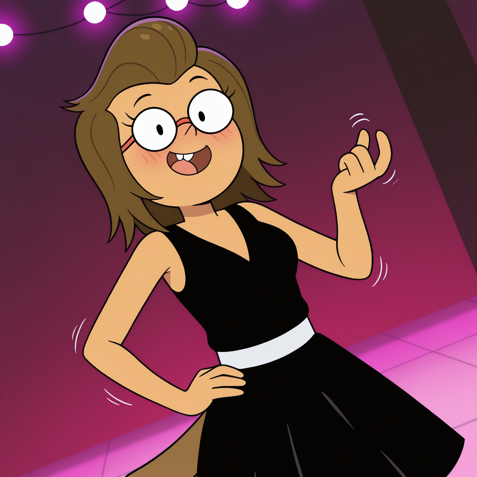 她的黑色连衣裙装扮:移除“侧马尾,浅绿色发圈”,替换为以下内容:黑色连衣裙,无袖连衣裙,交叉领,银色腰带,红色高跟鞋,头发向后梳顺