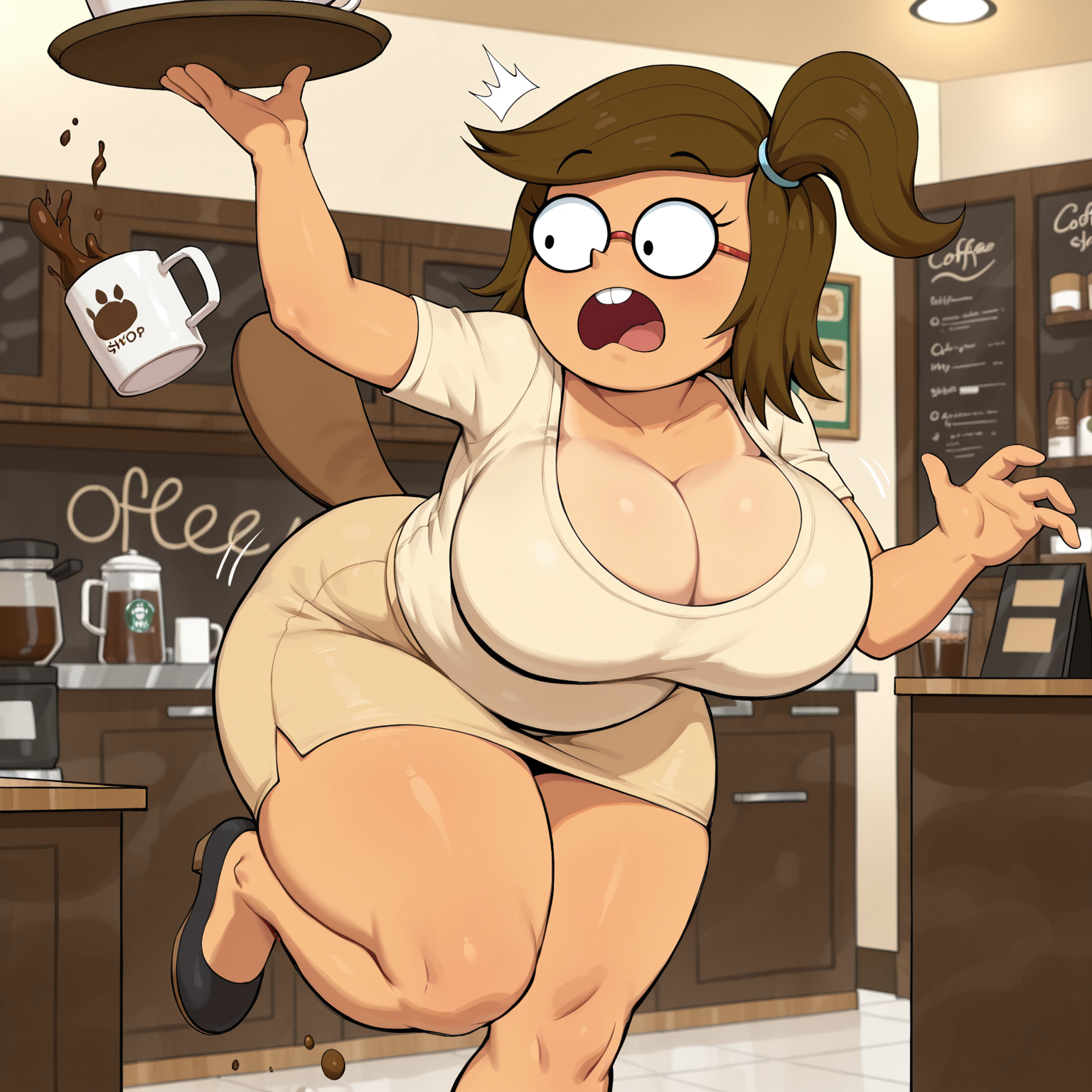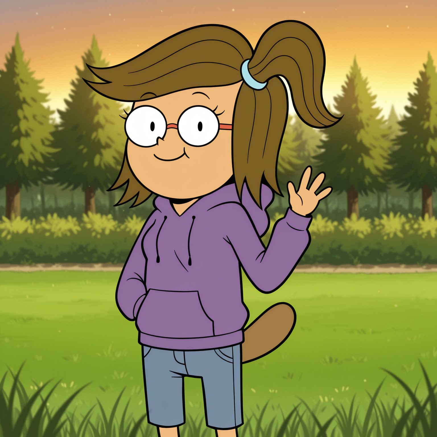 正面提示词:EilRS,女性人形,棕色头发,中等长度头发,侧马尾,浅绿色发圈,黑色眉毛,细眉毛,睫毛,圆框眼镜,黑色镜框,红色镜架,黑色眼睛,浅褐色皮肤,河狸女孩,河狸尾巴,棕色尾巴,短尾巴