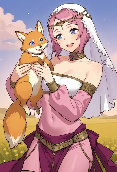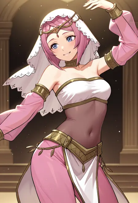 Trigger Words: LaylaFE, pink hair, short hair, blue eyes, veil, circlet, jewelry, choker, harem outfit, bare shoulders, detached sleeves, pink sleeves, white bandeau, strapless, covered navel, pink midriff, pink pants