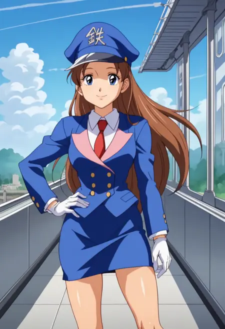 peaked cap, blue uniform, red necktie, white gloves, blue pencil skirt,