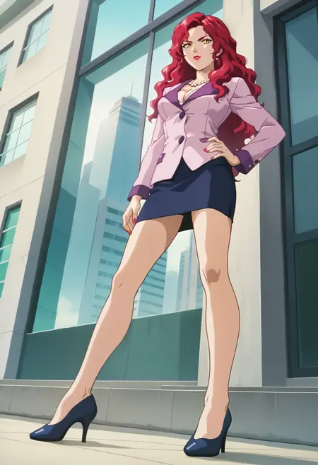白色项链, 暴露胸部, 粉色夹克, 深蓝色裙子, 铅笔裙,