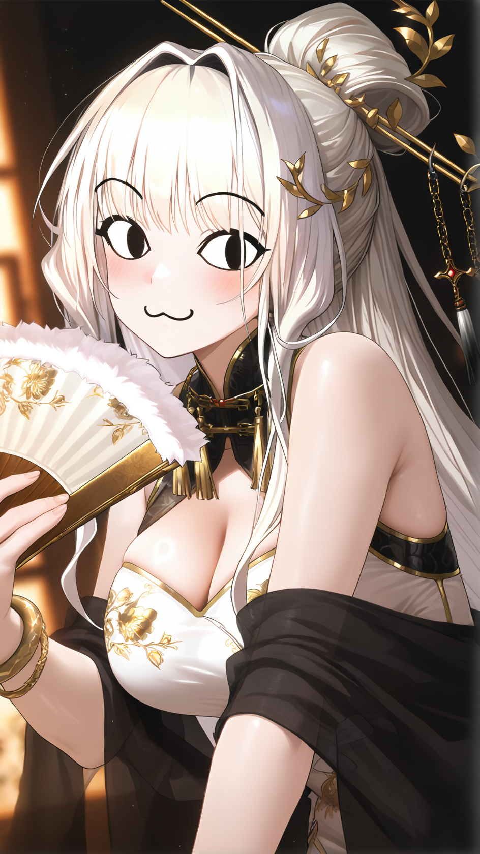 머리 장식, 드레스, 어깨 노출, 보석, 검은 신발, 흰 드레스, 검은 드레스, 하이힐, 팔찌, 옷 컷아웃, 중국 복장, 꽃무늬, 가슴 노출, 중국 드레스, 옆 절개, 금장식,