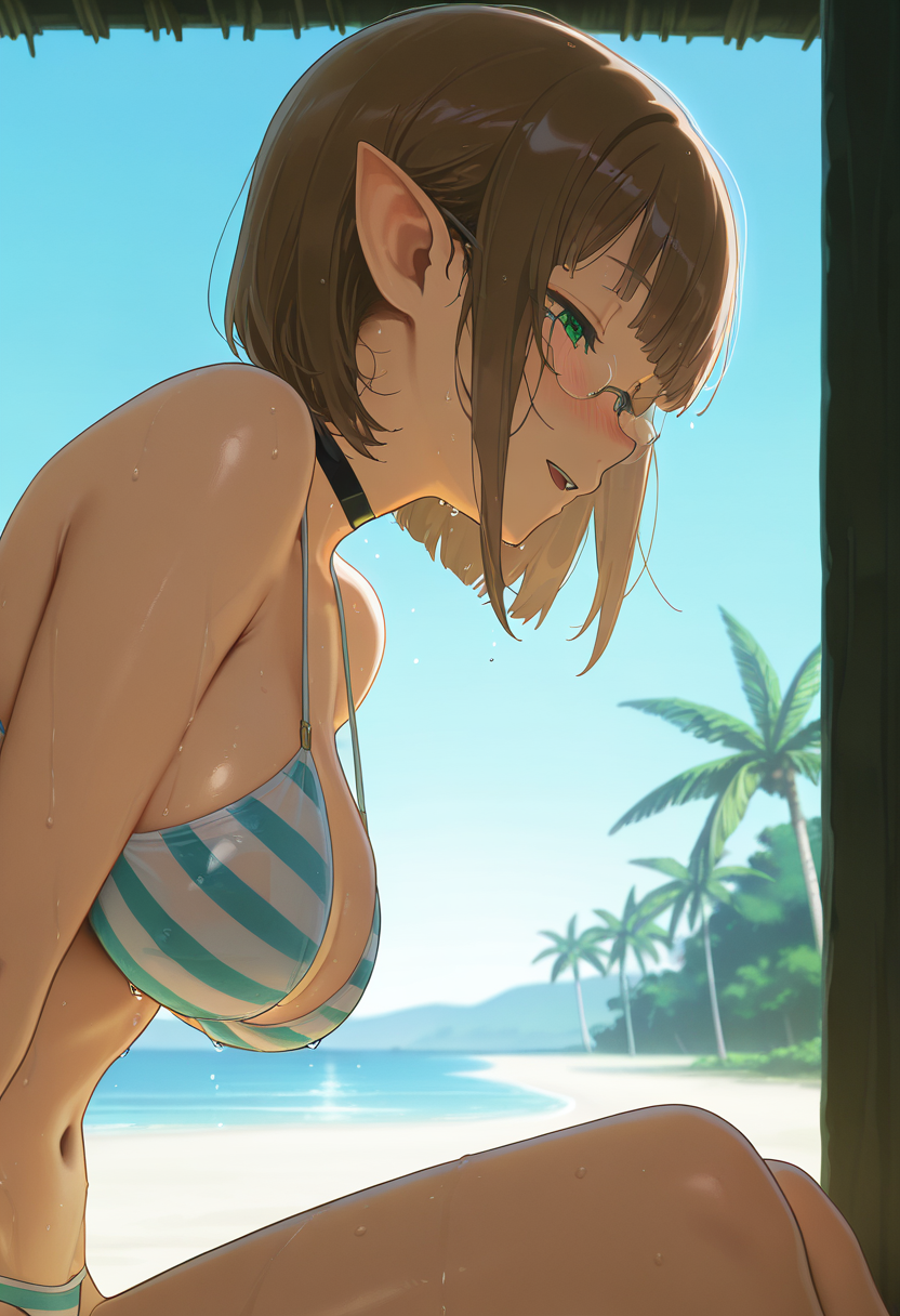 그녀의 외모 태그: 1girl, solo, short hair, large breasts, brown hair, green eyes, glasses, pointy ears, bob cut, elf,