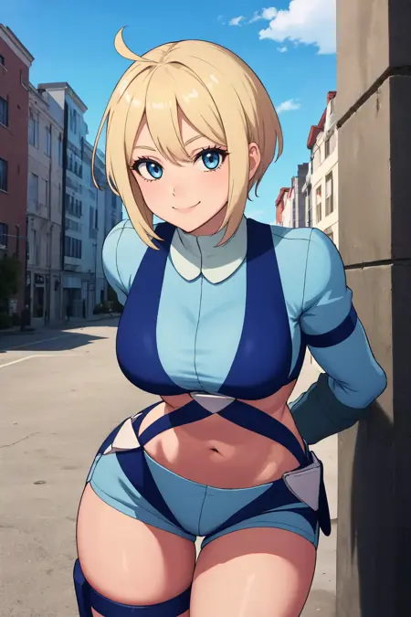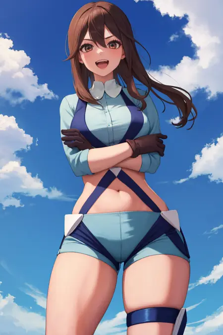 skylaoutfit、青いジャケット、へそ、腹部、青い手袋、青いショートパンツ、サスペンダー、太ももストラップ