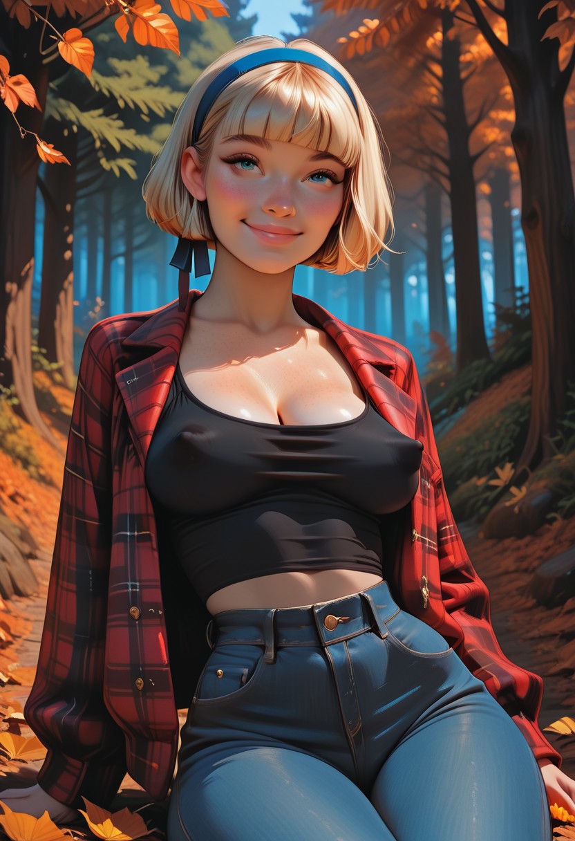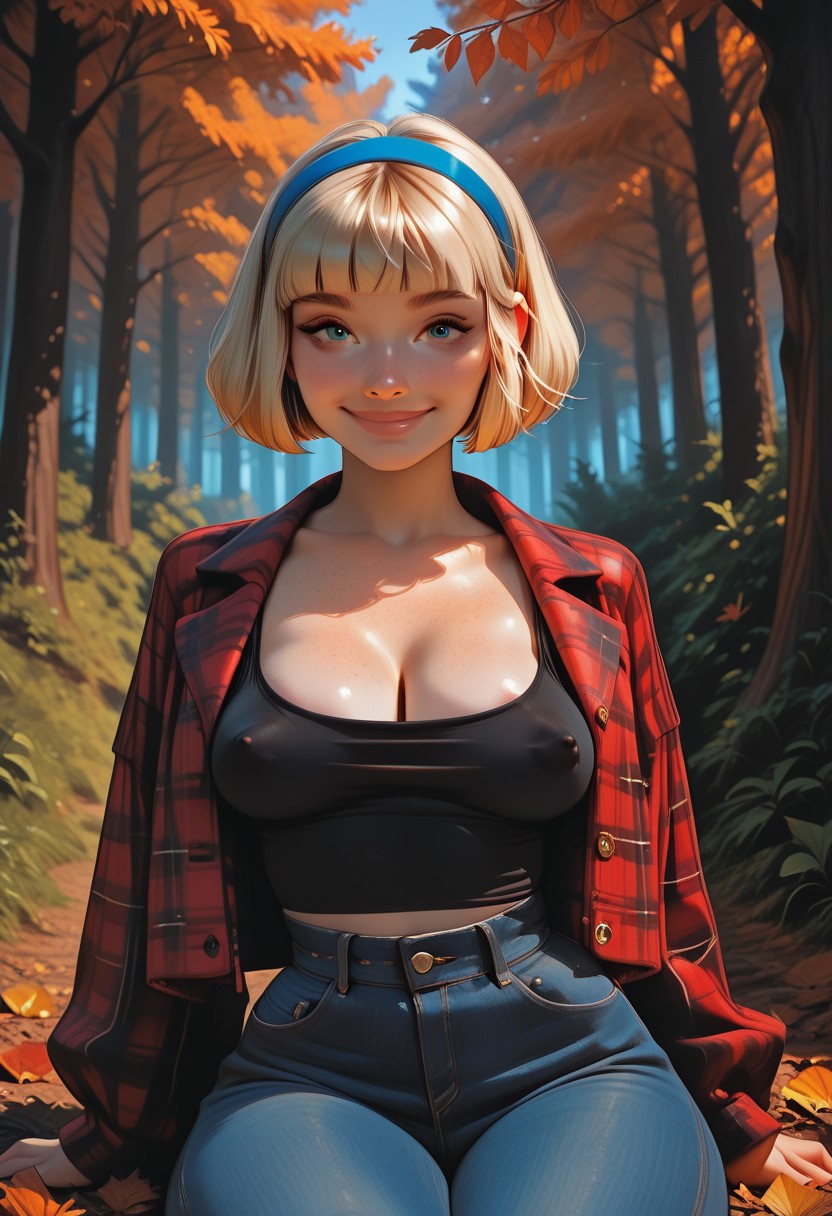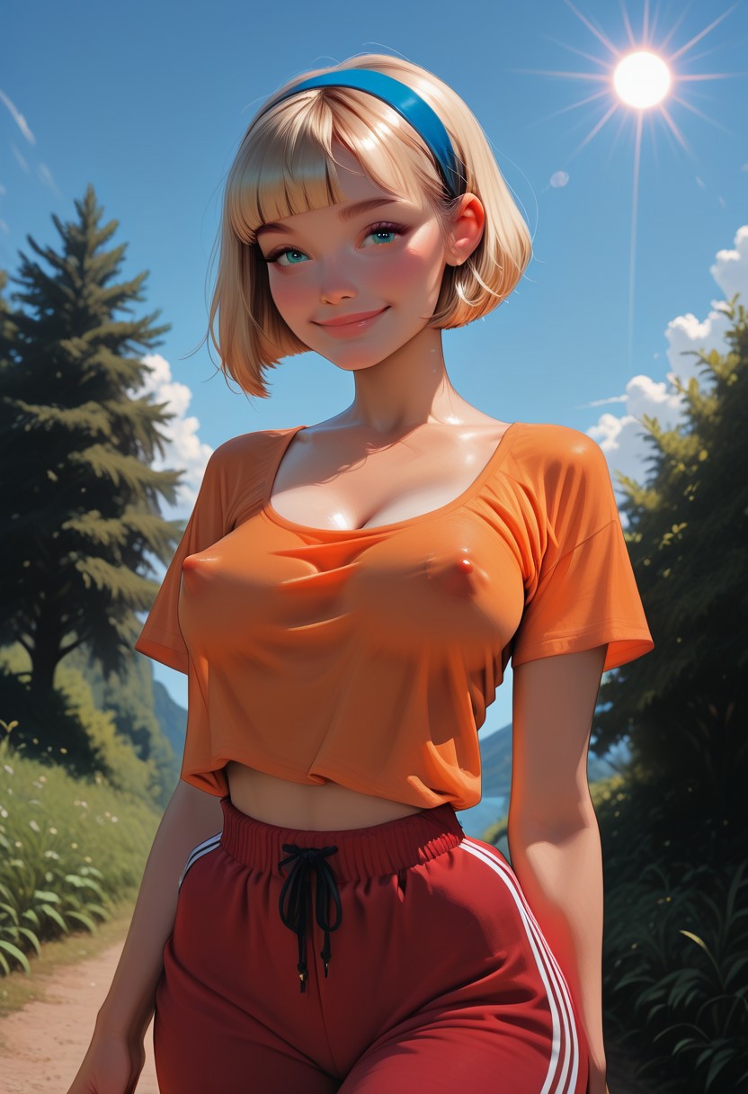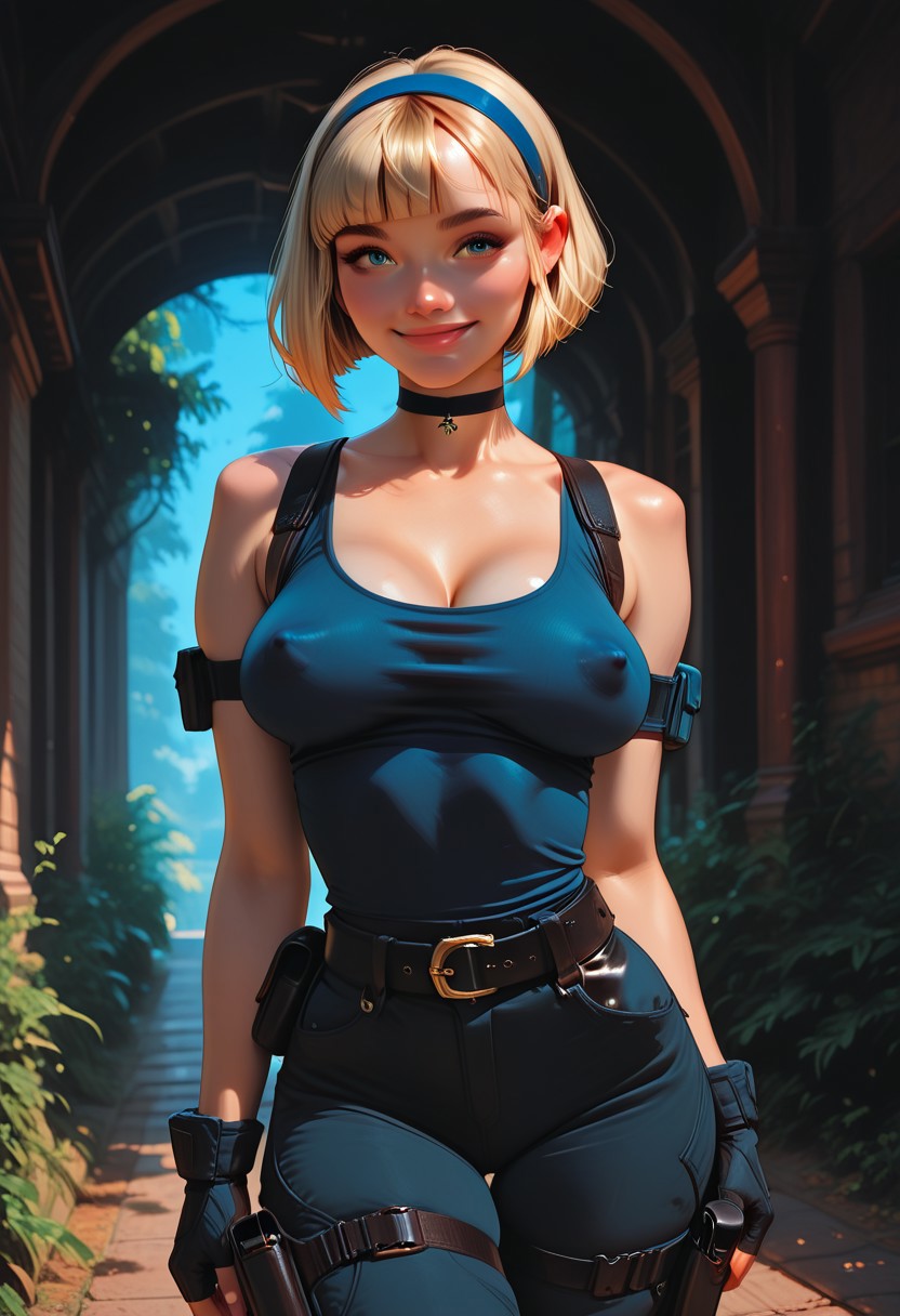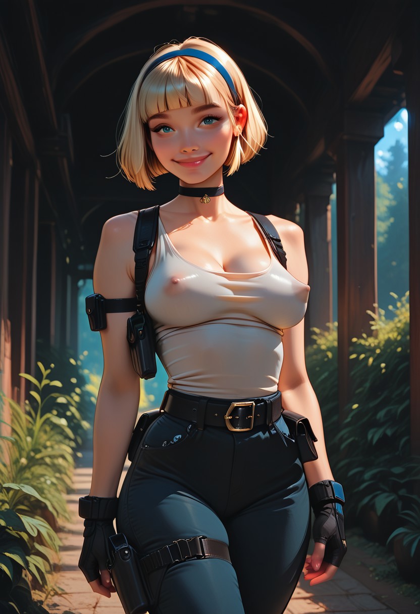 Other tags: short blonde hair, bobcut hairstyle, hairband, large perky breasts, slender, wide hips