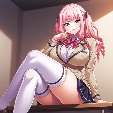 ユニフォーム: 白いシャツ、赤いリボンタイ、ベージュのブレザー、青い衿、長い袖、青いスカート、プリーツスカート、白い太ももハイ、茶色のローファー、