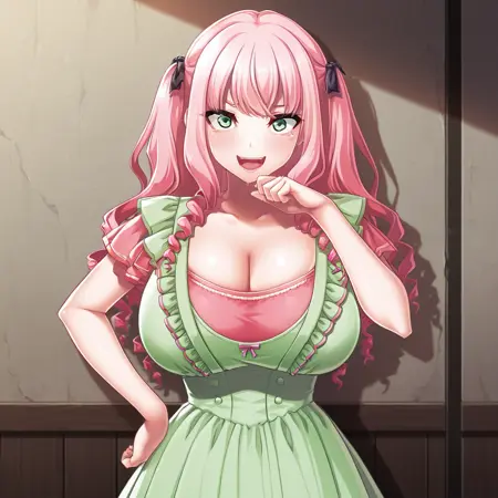 キャラクター: 1girl、長い髪、ピンクの髪、カール、黒い髪リボン、ツインテール、緑の目、大きな乳房、