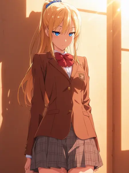 人物:blonde hair, blue scrunchie, long hair, ponytail, blue eyes,