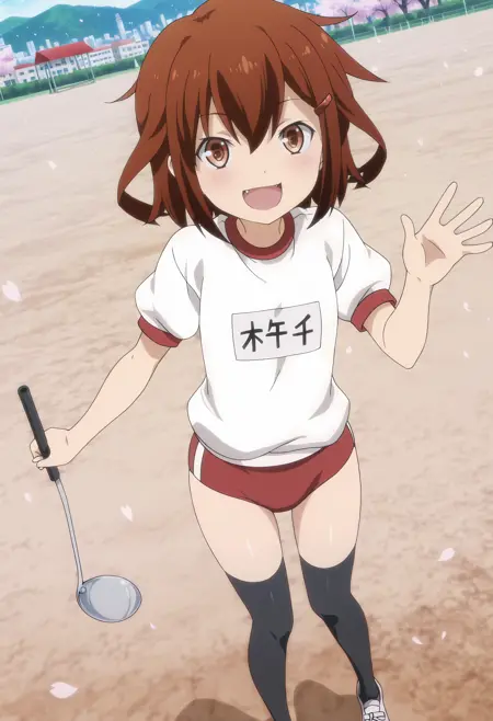 Gym: inazuma (character), gym_uniform (outfit), 1girl, light brown eyes, light brown hair, updo hair, long hair, gym uniform, white shirt, name tag, short sleeves, red buruma, black socks, sneakers