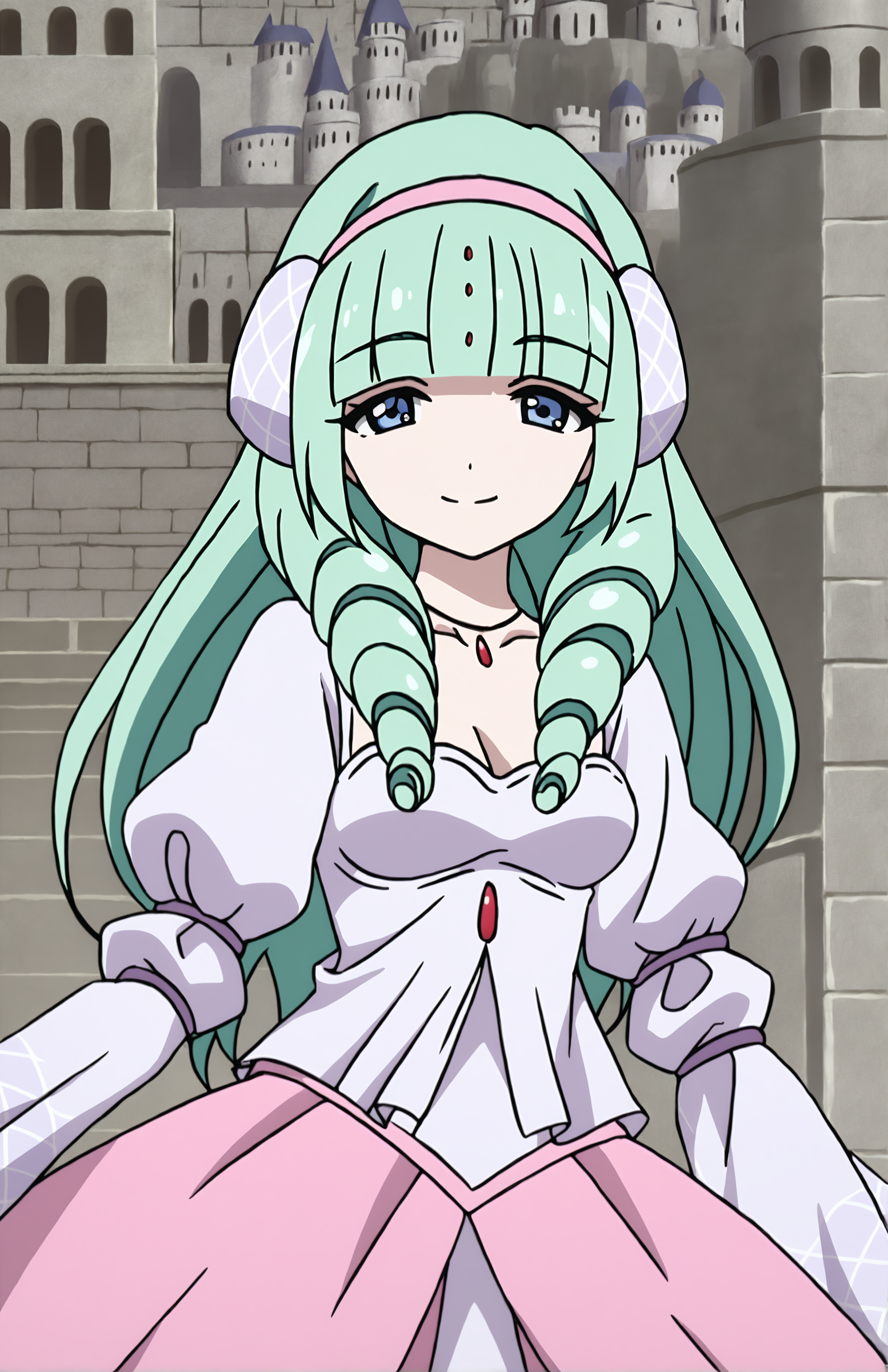 DunyaMagi, long hair, breasts, smile, bangs, blue eyes, long sleeves, dress, jewelry, hairband, green hair, puffy sleeves, blunt bangs, necklace, drill hair
