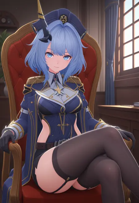 1 headgear,collared shirt,white shirt,epaulettes,blue jacket,side cutout,black gloves,belt,black shorts,gold trim,garter straps,black thighhighs,military uniform