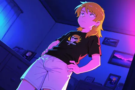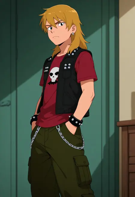 다일렌, 1명, 남성, 어두운 금발의 머릿결, 둥근 귀, 은색 귀걸이, 마젠타 티셔츠, 검은 조끼, 검은 스파이크 팔찌, 어두운 녹색 카고 바지, 은색 체인, 검은 스니커즈,