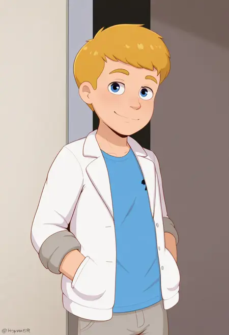 다일렌WR, 1명, 남성, 어두운 금발, 둥근 귀, 파란 티셔츠, 흰색 재킷, 회색 청바지, 파란 스니커즈,
