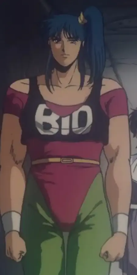 80年代のアニメ、リッキー(Violence Jack 2: Evil Town)、青髪、黄色い髪留め、茶色い瞳、片側ポニーテール、汗をかいた肌の女性、筋肉女子、プロレス、グレーのブレスレットプロレス、ヌード、タイツ、大きな胸、NSFW、湿ったわきの下、わきの下、性器、乳首