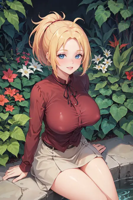 zenith_greyrat, solo, large breasts, ponytail, short hair, shirt, long sleeves, red shirt, ahoge, ribbon, skirt