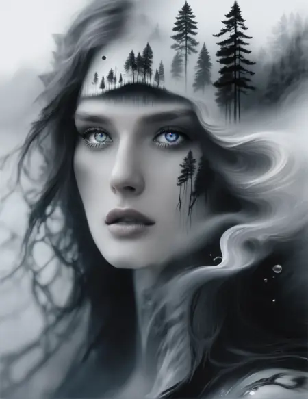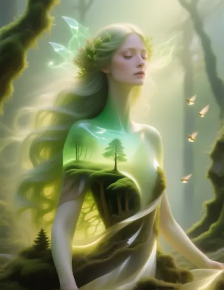 (elemnt/style) dryad, double exposure, nature spirit, fantasy portrait, ethereal realism