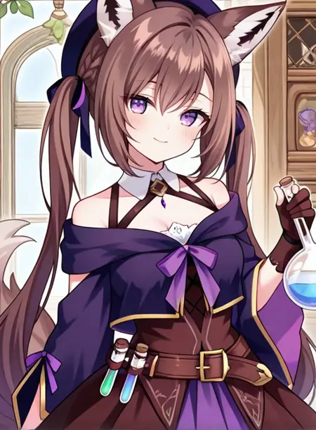 Komiya_Suzu, 1소녀, 단독, 긴 머리, 가슴, 큰 가슴, 갈색 머리, 동물 귀, 리본, 매우 긴 머리, 쌍辫, 중간 가슴, 보라색 눈, 꼬리, 땋은 머리, 머리 리본, 옆머리, 머리 리본, 동물 귀 털, 여우 귀, 스윕 앞머리, 여우 꼬리, 여우 소녀, 보라색 리본, 주름진 이마, 가상 유튜버, 송곳니