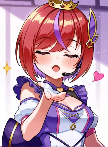 AnniePrincessu, 1girl, solo, breasts, short hair, purple eyes, purple hair, multicolored hair, red hair,virtual youtuber, streaked hair, tiara, crown
