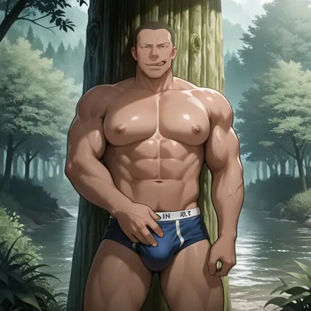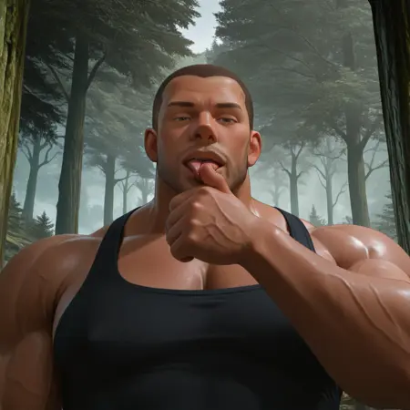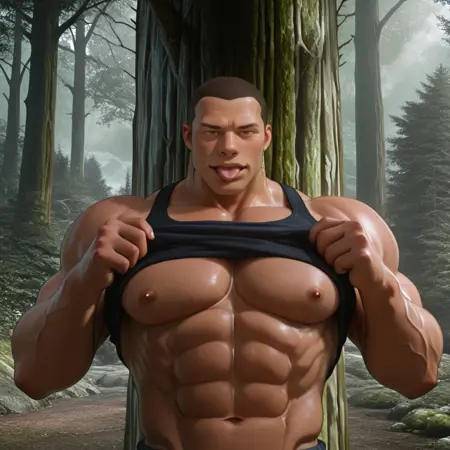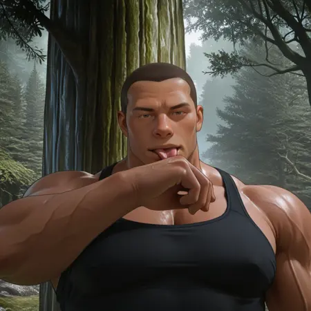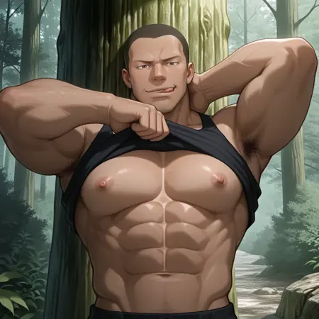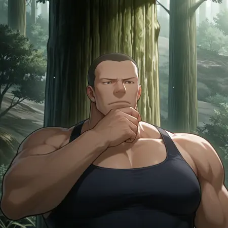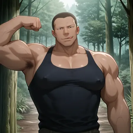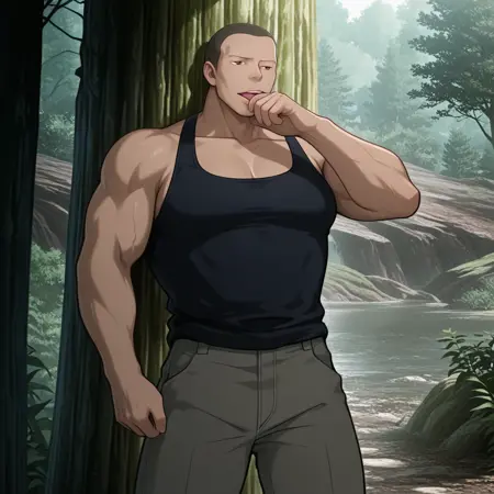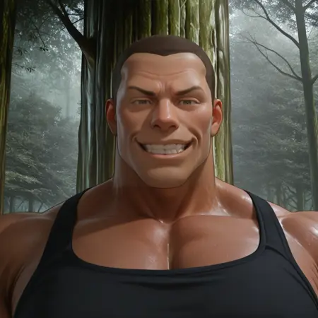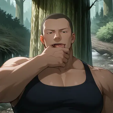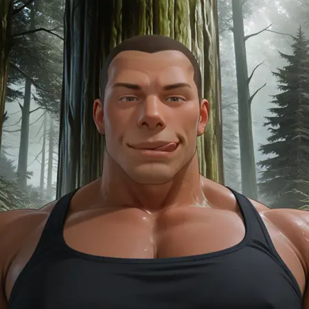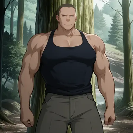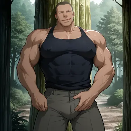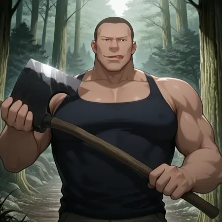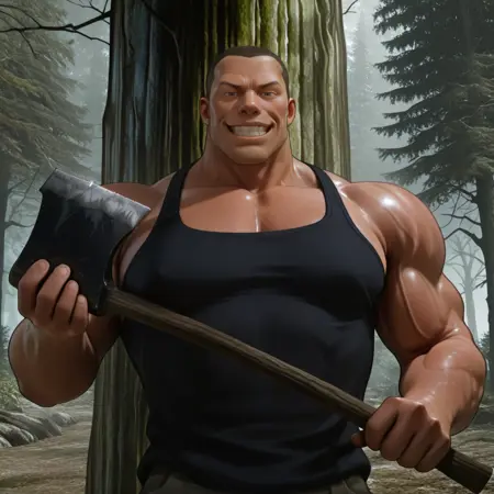 デフォルトの外見: 斧、ブラックタンクトップ、グレーのズボン