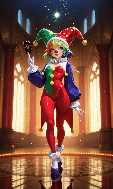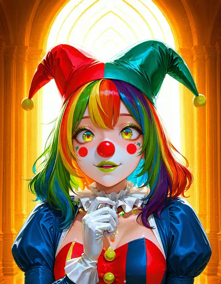 Human, expressive eyes, perfect face, hazelnut eyes, lime green lipstick, multicolored hair, rainbow hair, long wavy hair, clown nose, vibrant bicolor clown costume, red green blue tones, white gloves, white ruffled collar, jester hat