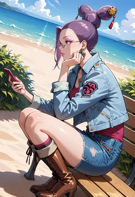 服装: 绷带,手套,露指手套,胸部,高跟鞋,靴子,高跟靴,外套,裤子,腰带,蓝色外套,露脐,棕色鞋履,蓝色裤子,敞开式外套,敞开式服装,卷起袖子,黑色手套,中等胸部,大胸部,长外套,胸部绷带,珠宝,棕色手套,耳环,链条,黑色鞋履,吊带背心,及膝靴,无肩带