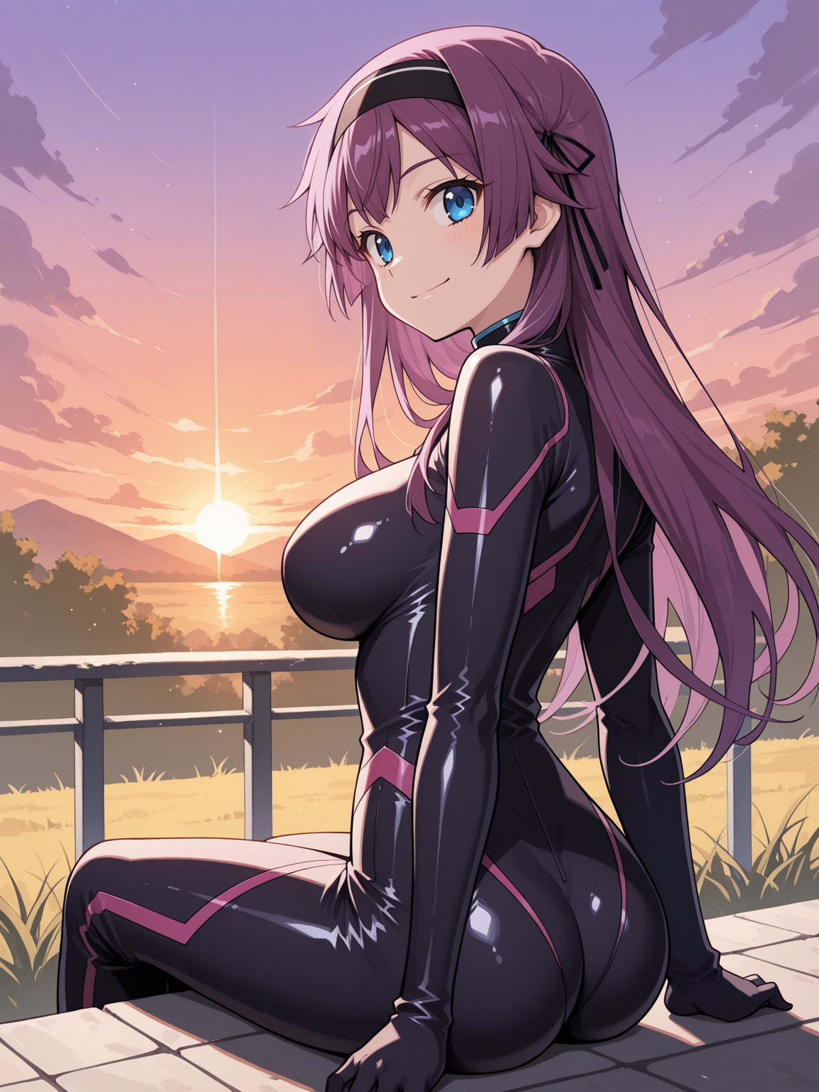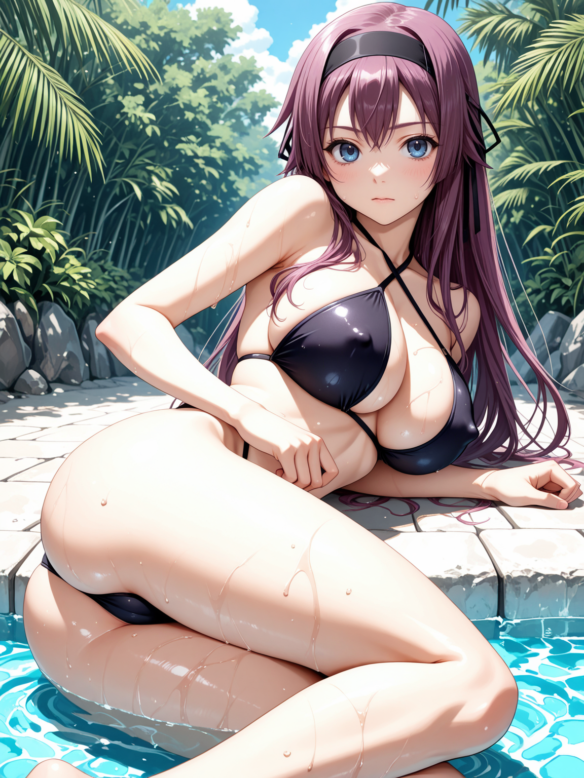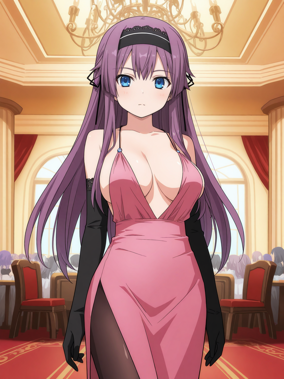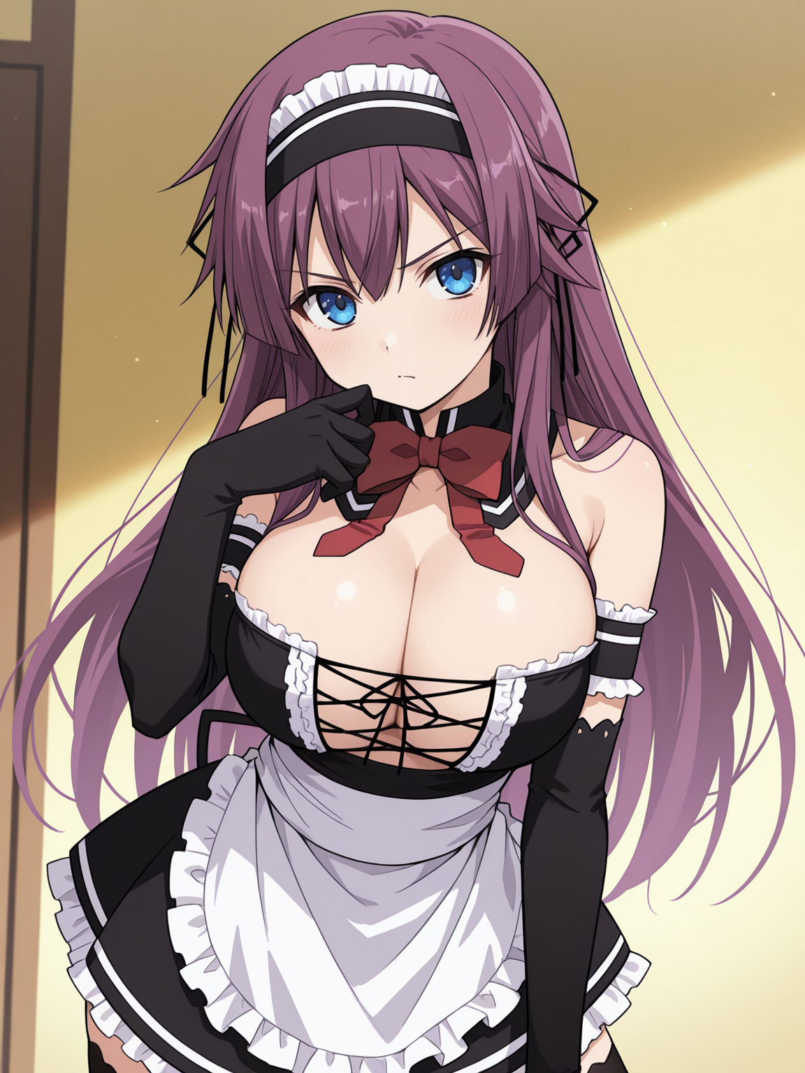 外观:面无表情,长发,紫色头发,蓝色眼睛,发带,大胸部
