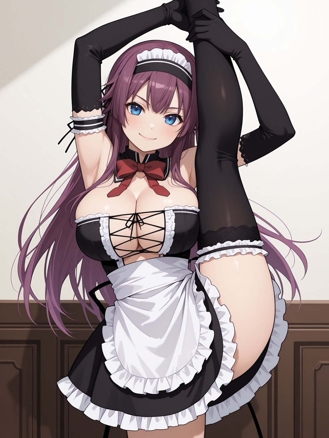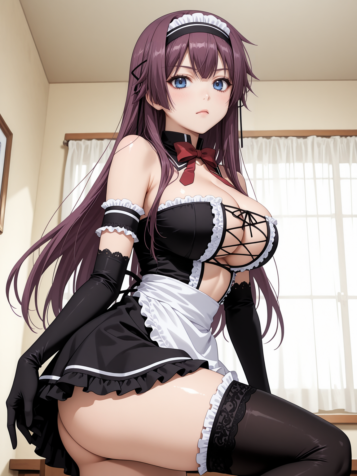 服装:女仆围裙,女仆头饰,黑色短裙,露胸,交叉系带服装,无肩带,肘部手套,黑色手套,褶边臂环,可拆卸领子,黑色领子,红色领结,黑色过膝袜,褶边过膝袜