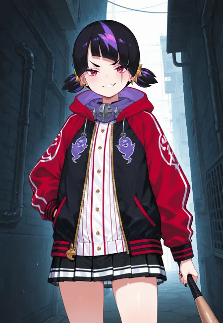 의상 - 자켓, 후드 자켓, 이톤 자켓, 빨간 자켓, 검은 자켓, 열린 자켓, 흰 셔츠, 줄무늬 셔츠, 수직 줄무늬 옷, 치마, 미니 치마, 검은 치마, 주름 치마, 드러난 다리, 빨간 신발