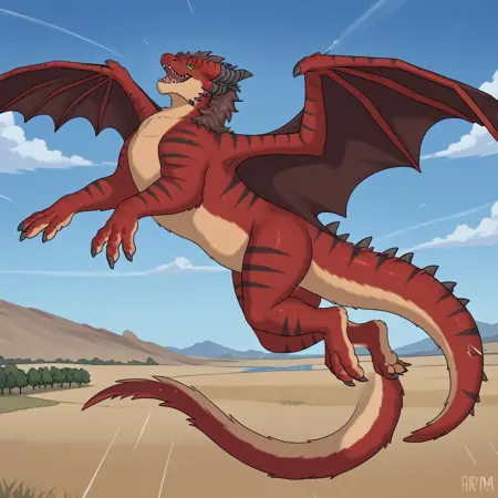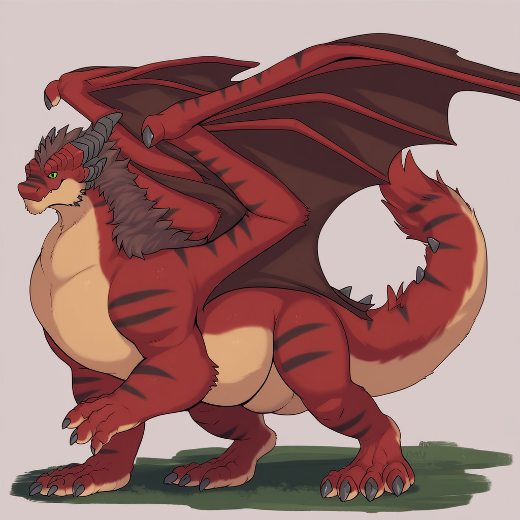 dragon, furred dragon, western dragon, red and tan fur, black stripes, green eyes, brown mane, dragon horns, dragon wings, dragon tail, back spikes, tail spikes, claws,