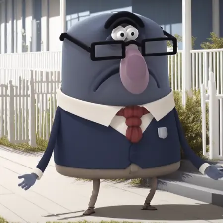 GLRobinson, Tawog_robinson, 1boy, long pink nose, squared glasses, grey and blue mix skin, oval shaped eyes, red tie, white shirt, brown pants, brown shoes, unibrow, black eyebrows, bald