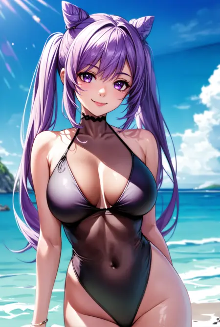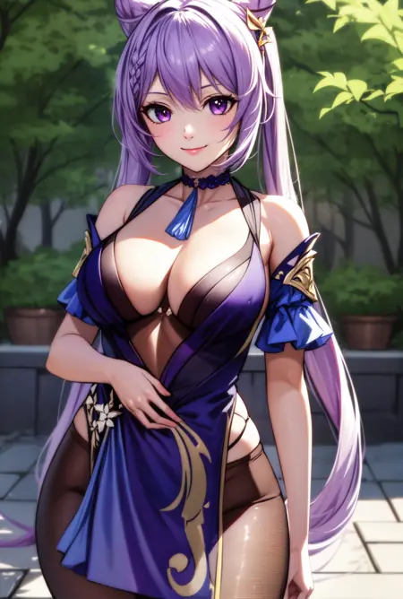 KeqingGenshin_NDV, 1girl, 보라색 머리, 큰 가슴, 긴 머리, 트윈테일, 보라색 눈, 팬티스타킹, 원뿔형 머리 둥글게 묶기, 더블 둥글게 묶기, 초커, 드레스, 분리된 소매, 프릴