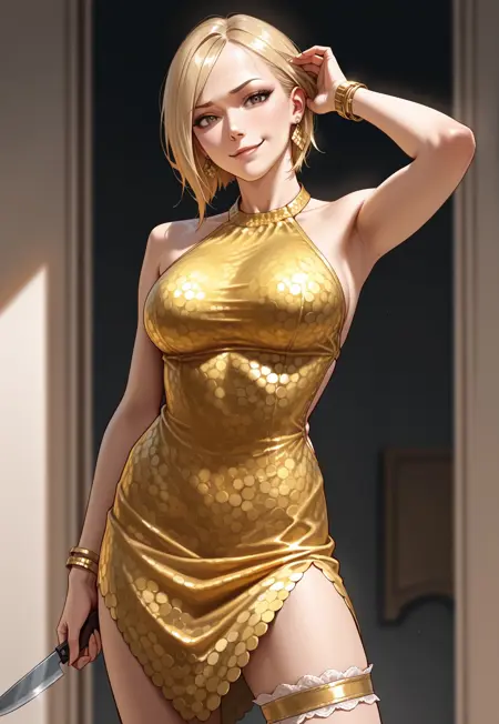 - gold halterneck dress, sleeveless, bracelet, earrings, jewelry, bridal garter, gold sandals