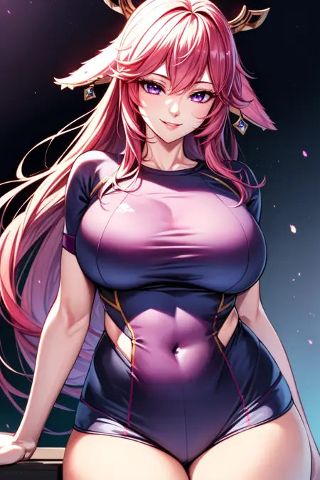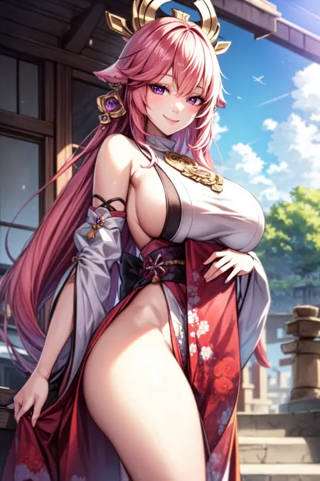 YaeMikoGenshin_NDV, 1girl, pink hair, large breasts, long hair, japanese clothes, dress, jewerly, fox ears, animal ears, purple eyes, sideboob, floppy ears, hair ornament