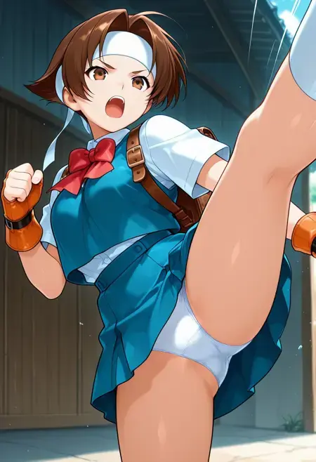 HinataWa, 1girl, solo, brown hair, short hair, parted bangs, ahoge, brown eyes, medium breast, narrow waist, large hips, toned body, white headband, school uniform, backpack, red bowtie, white shirt, collared shirt, blue vest, blue skirt, short sleeves, pleated skirt, miniskirt, red bow, fingerless orange gloves, fight gloves, white socks, sneakers,