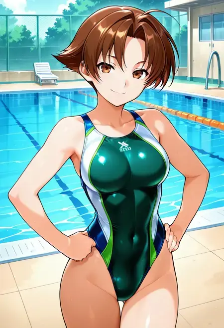 HinataWaSport, 1girl, solo, brown hair, short hair, parted bangs, ahoge, brown eyes, medium breast, narrow waist, large hips, toned body, toned belly, covered navel, competition swimsuit, multicolored swimsuit, black blue and green one-piece swimsuit, collarbone, clothes writing, groin, highleg swimsuit, thigh gap, barefoot,