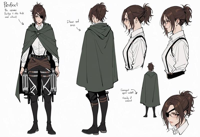 衣装: ブーツ、パラディス軍服、調査兵団(エンブレム)、マント、ベルト、ジャケット、膝上ブーツ、太ももストラップ、エンブレム、軍服