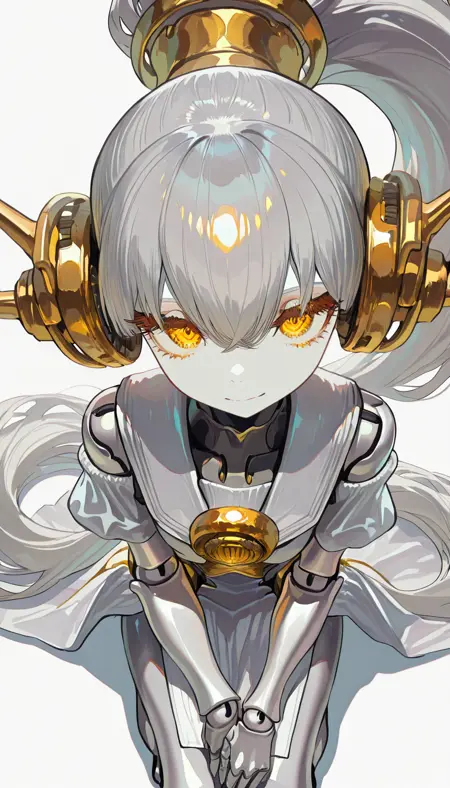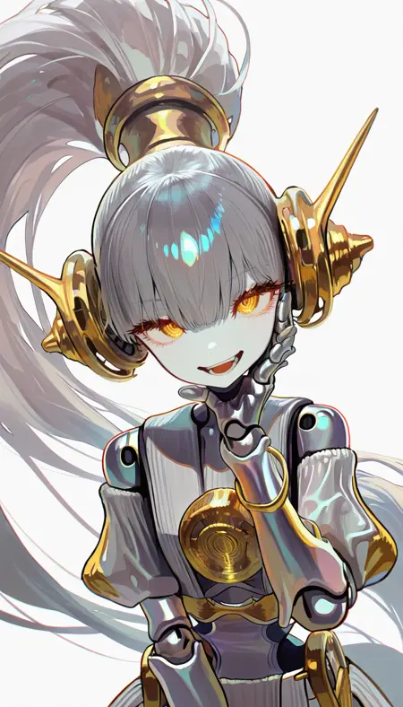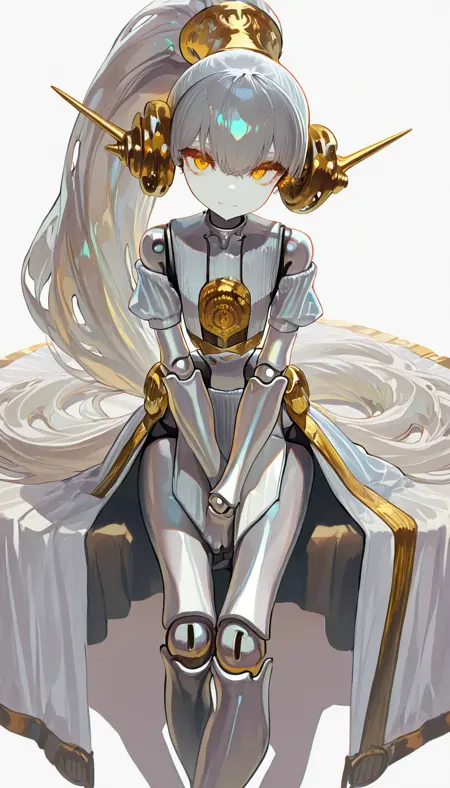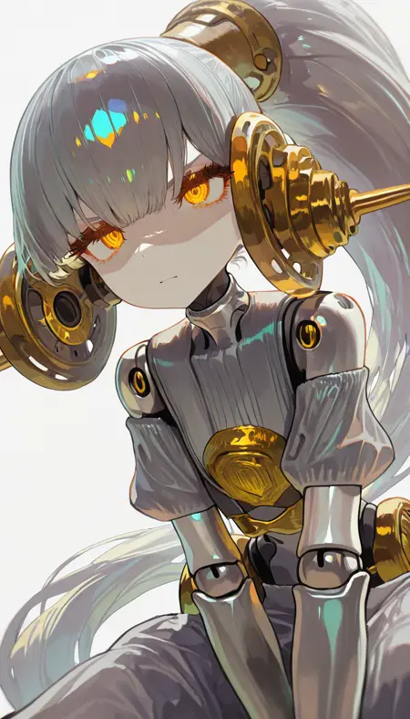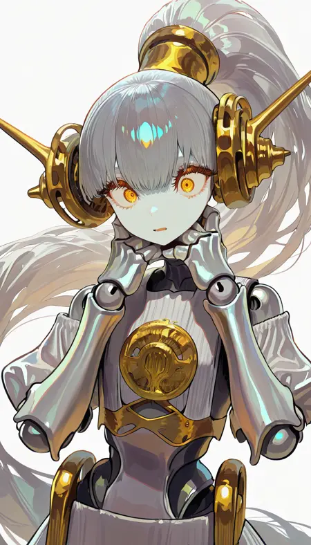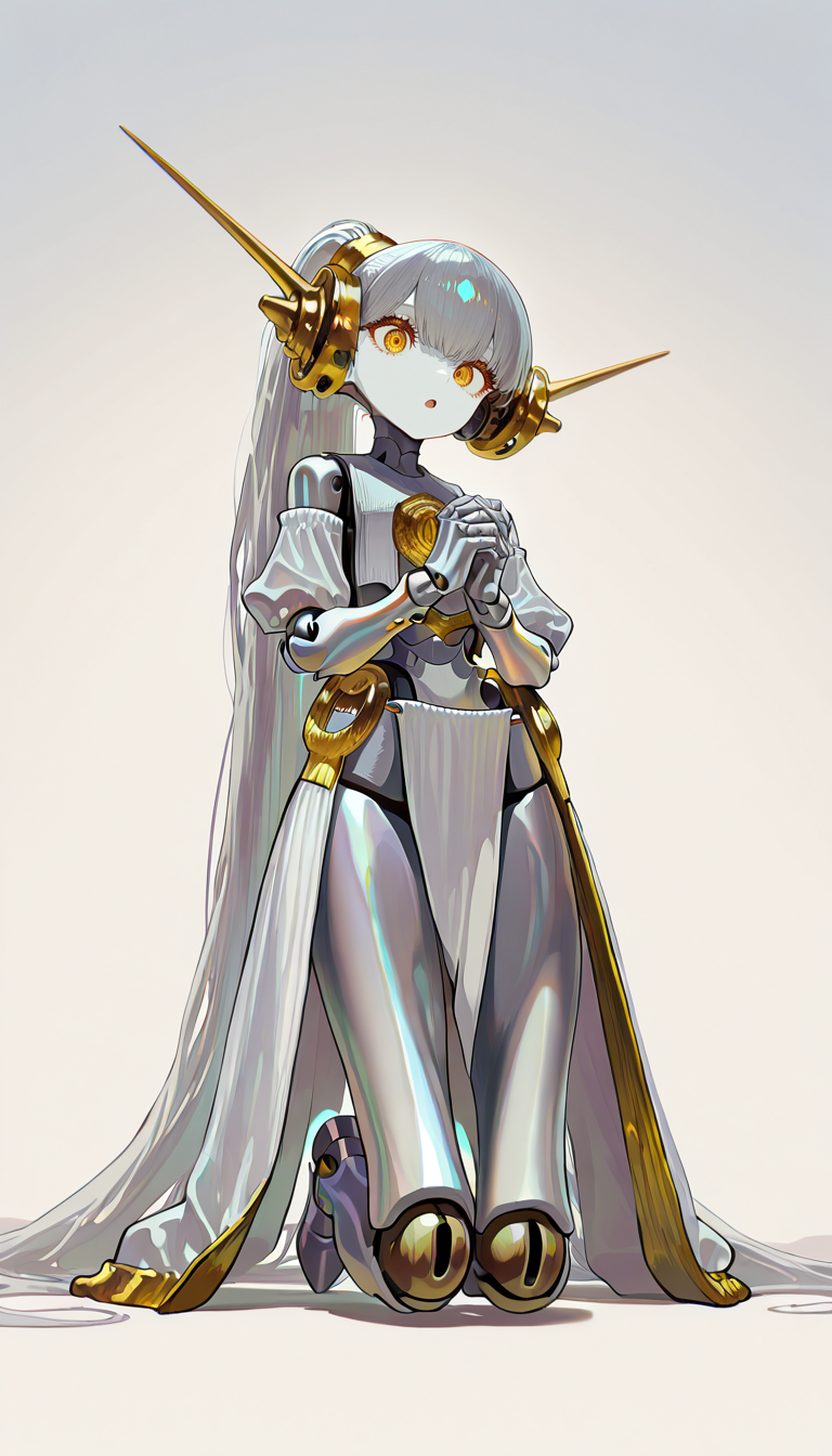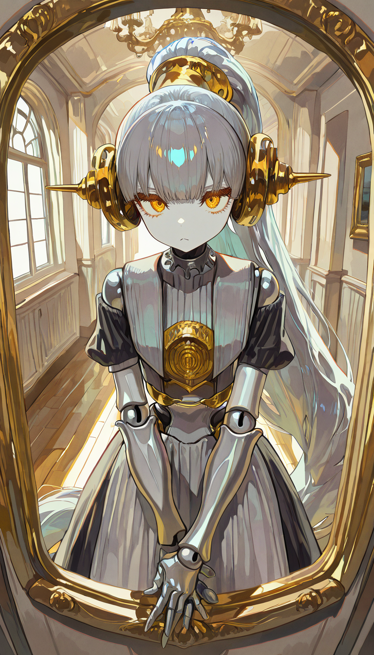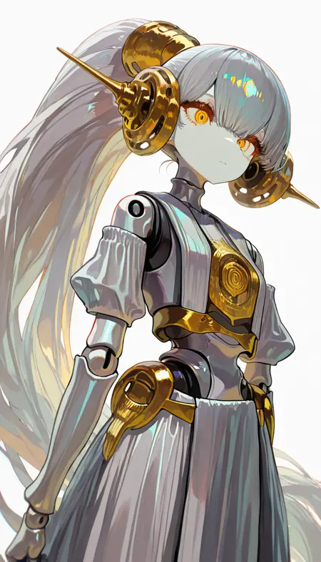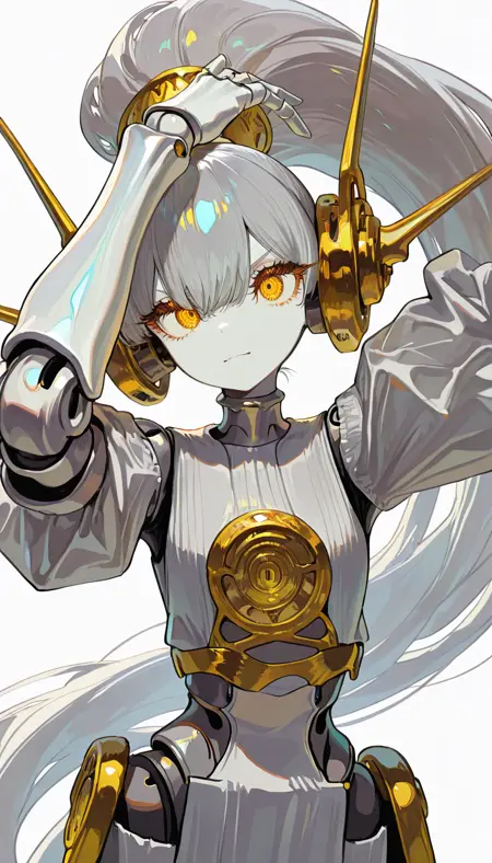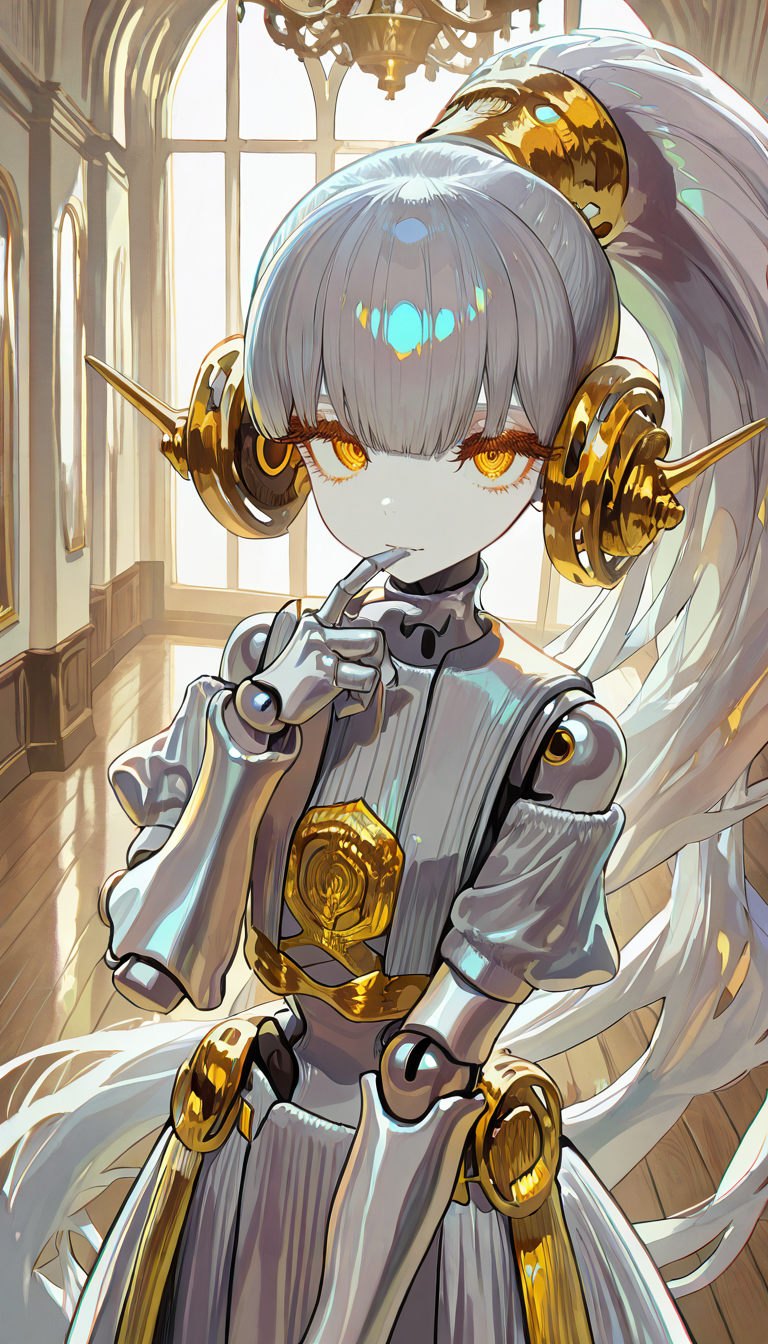 1girl、PonyGear、異常に長い髪、ポニーテール、灰色の髪、黄色い目、ロボット関節、ドール関節、金色の目、ドレス、アンドロイド、色付きの肌