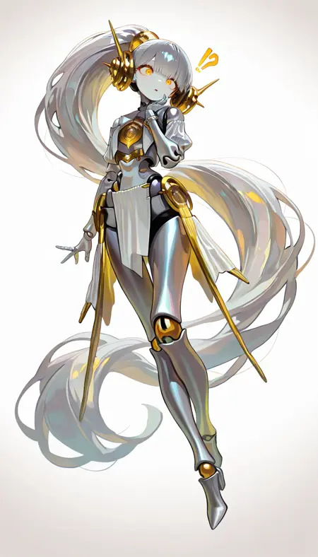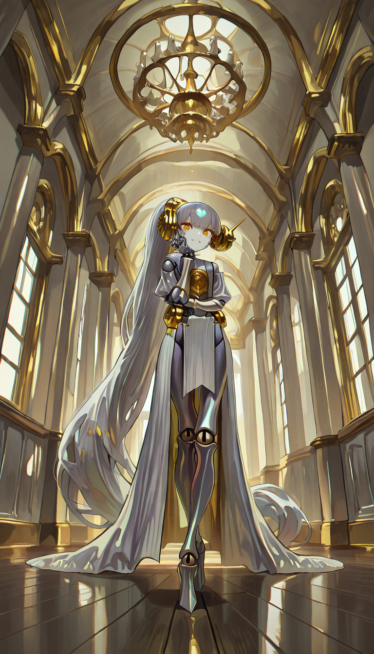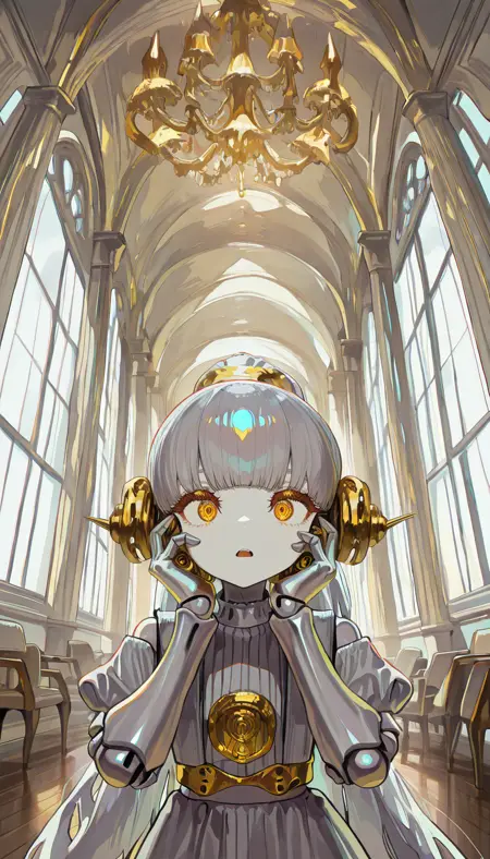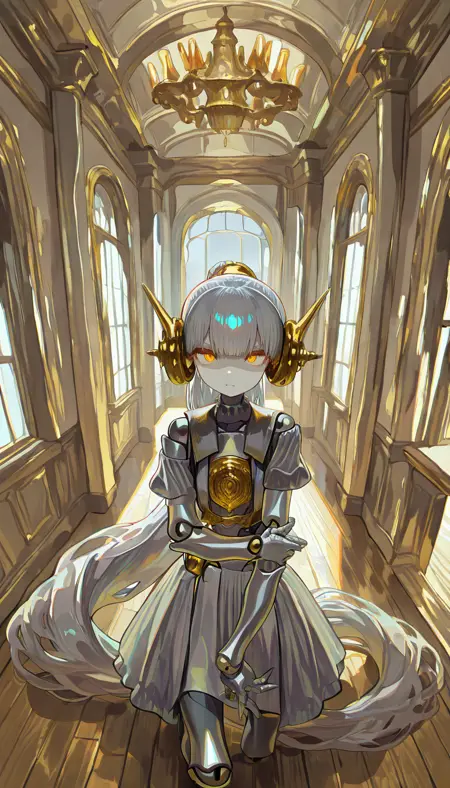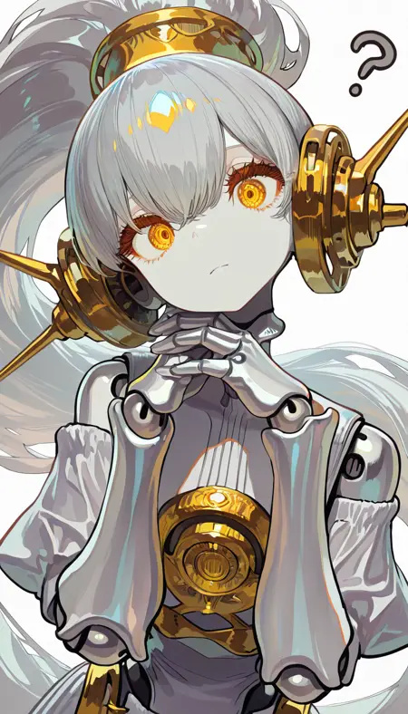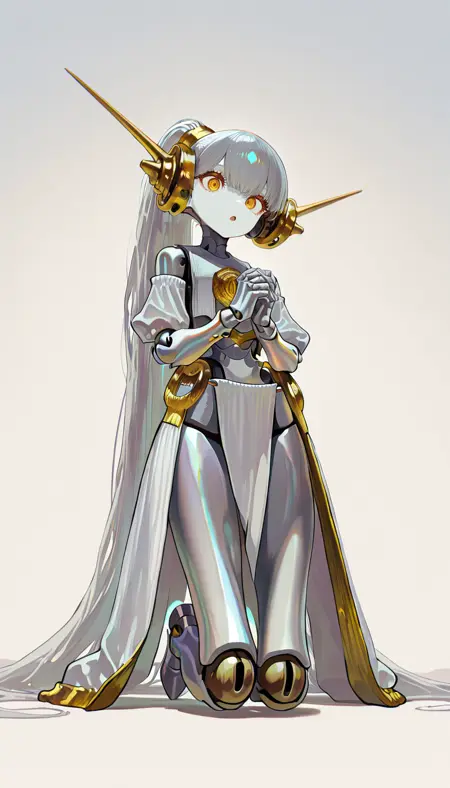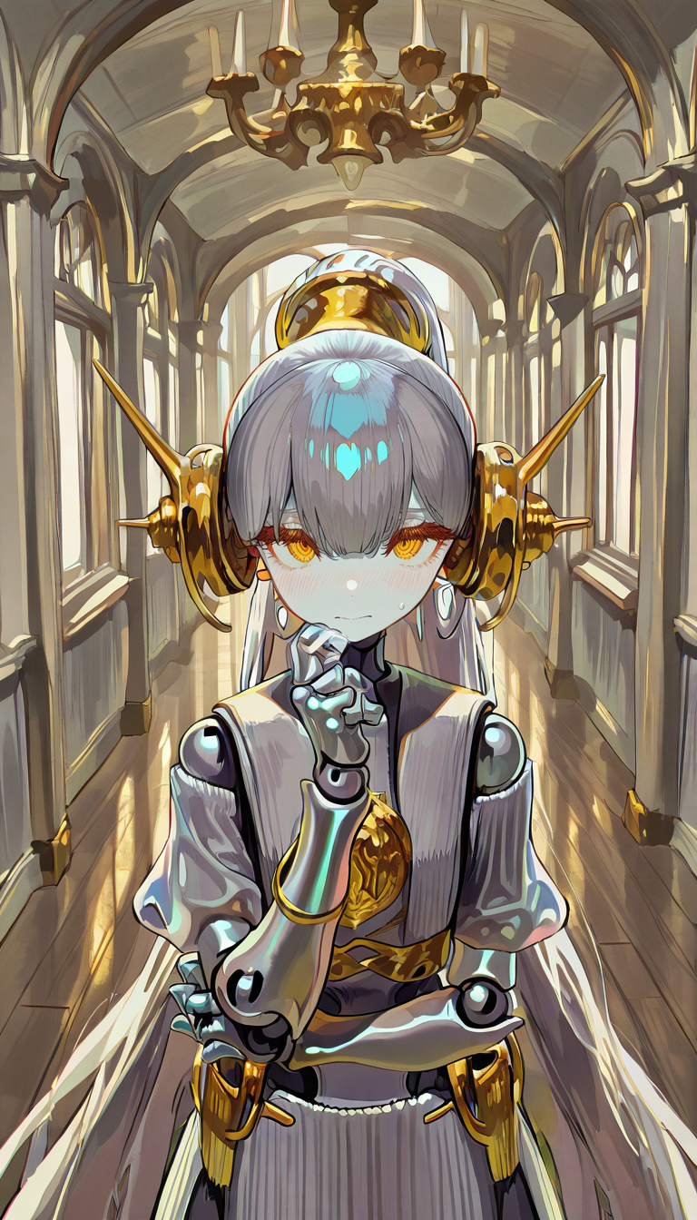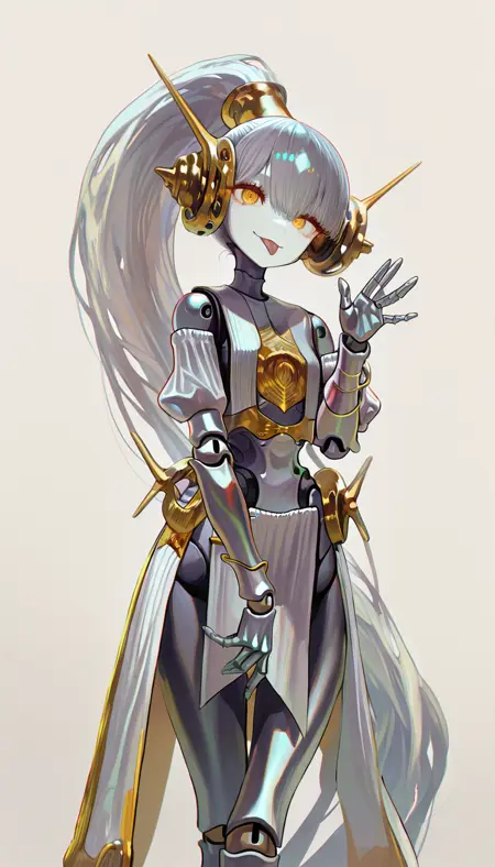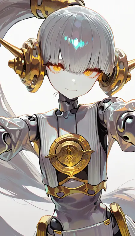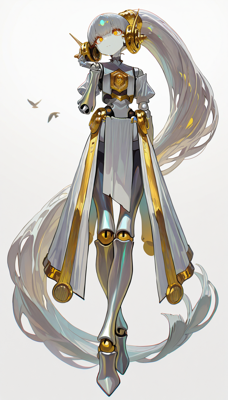 1girl、PonyGear、異常に長い髪、ポニーテール、灰色の髪、黄色い目、ロボット関節、ドール関節、金色の目、ドレス、アンドロイド、色付きの肌