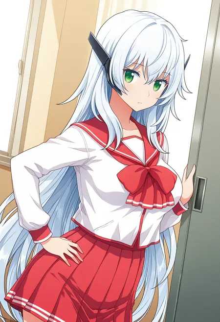 • 校服,红色水手领,白色衬衫,红色镶边,长袖,红色领结,红色蝴蝶结,红色领巾,百褶裙,红色裙子,