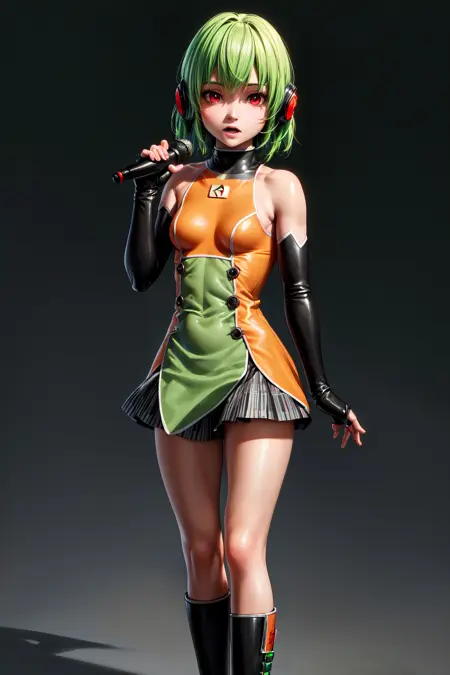 示例提示词:stsflchan, 1girl, (singing, holding microphone), sitting, full body, green hair, ahoge, short hair, elbow gloves, headphones, red eyes, [fingerless gloves, skirt, knee boots], looking at viewer, bare shoulders