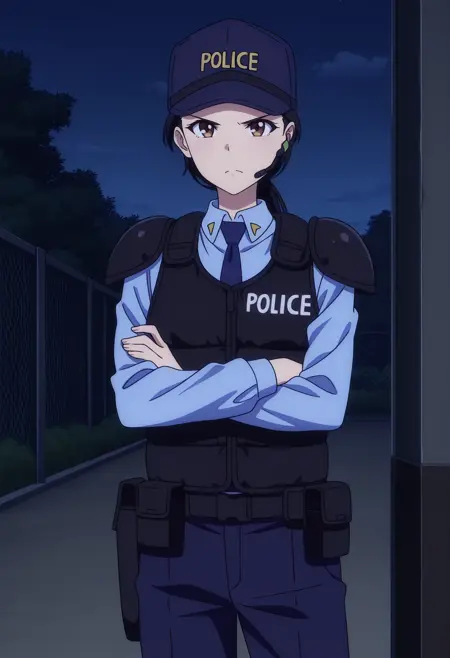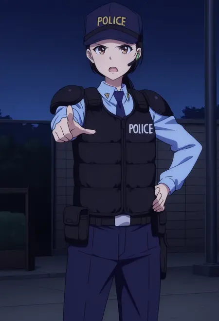 警察制服, ベースボールキャップ, 警察帽, 耳掛け, ヘッドセット, ワイアレスレシーバー, 女性警察官, カラーシャツ, 青シャツ, 青ネクタイ, ショルダーパッド, 防弾チョッキ, 衣服に書かれた文字, ボディアーマー, 青ズボン, 黒ズボン,