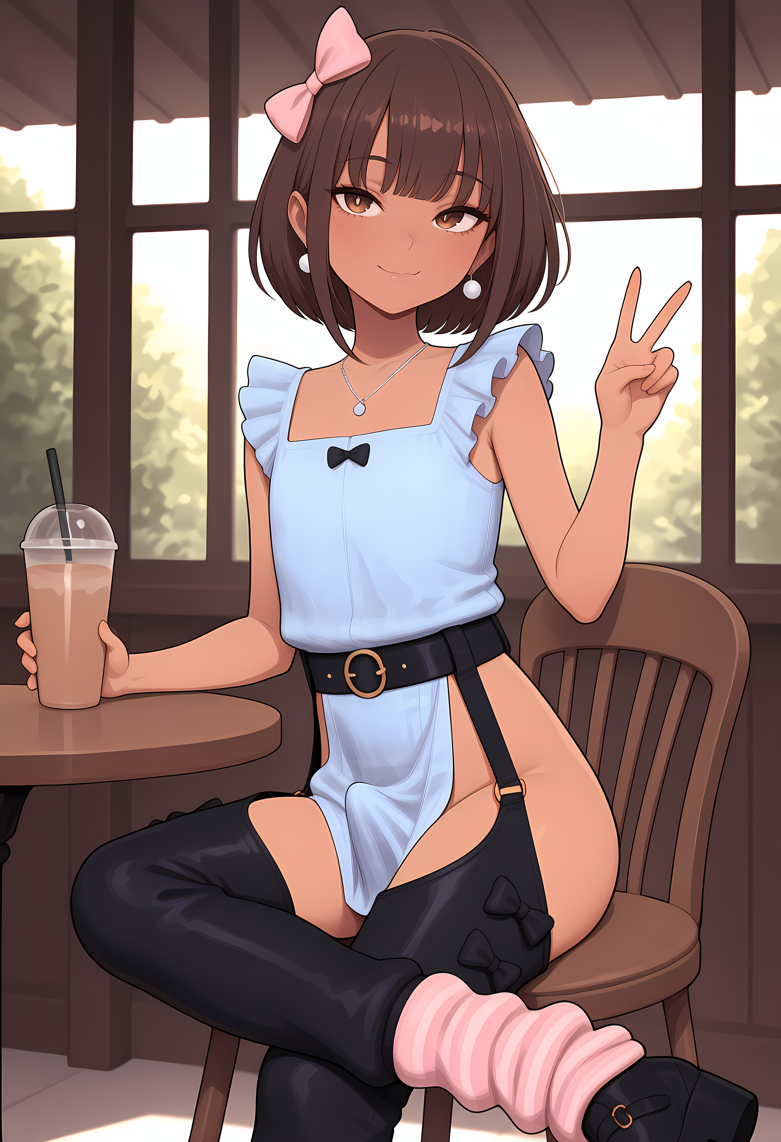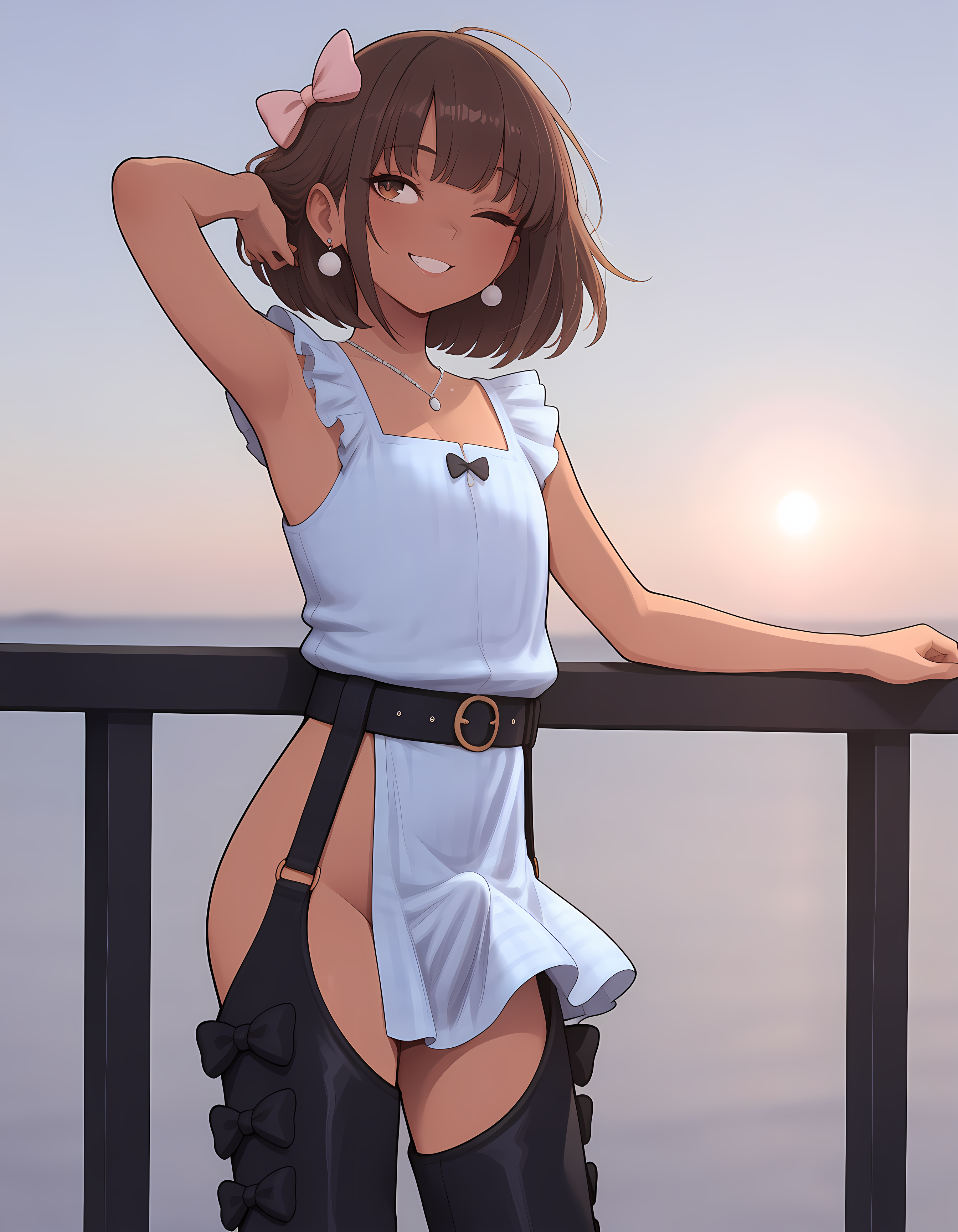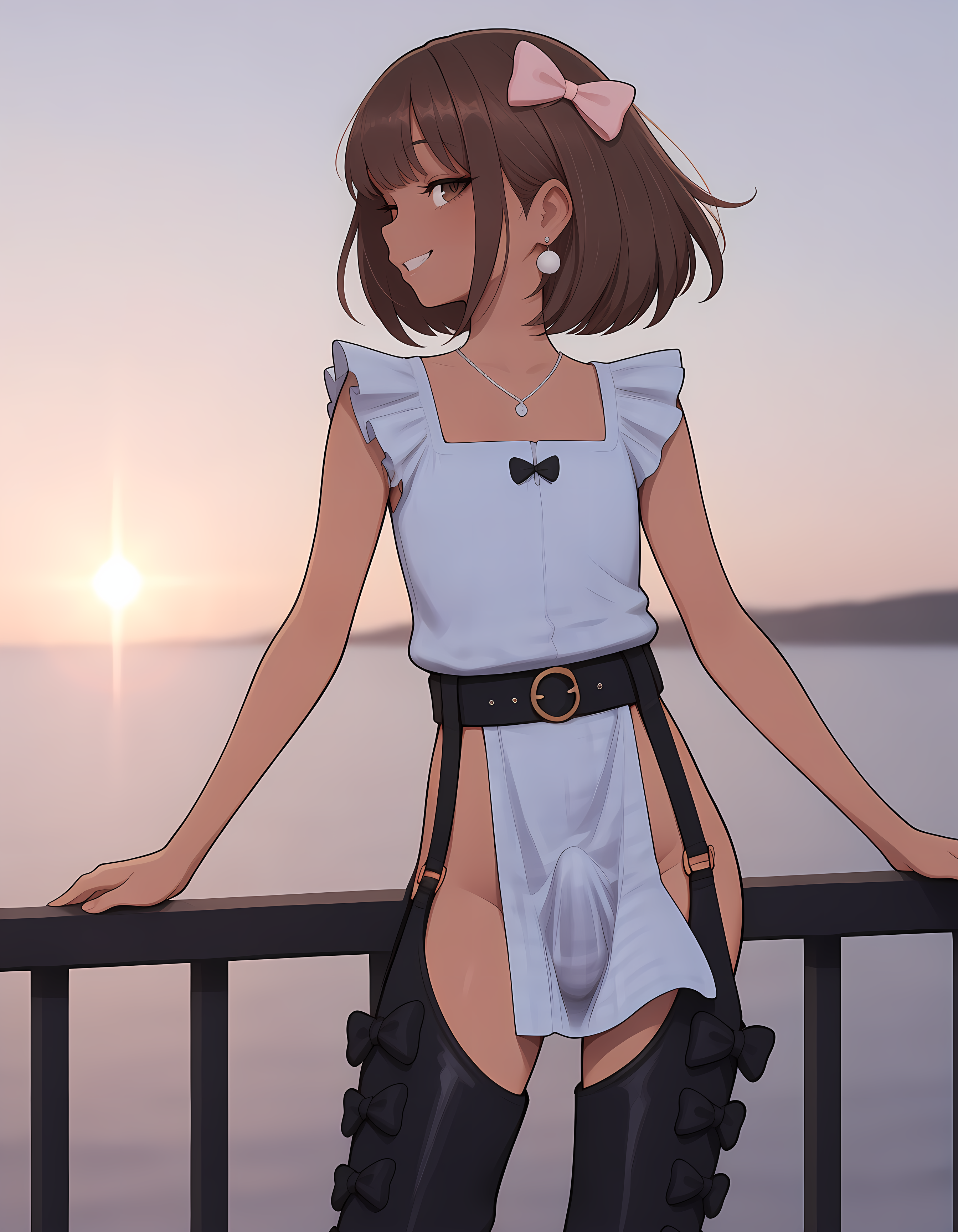 MayaE,1boy,otoko no ko,young,brown hair,brown skin,brown eyes,short hair,silver earrings,silver necklace,pink ribbon, freckles,