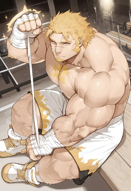 裸露上身,白色运动短裤,黑色拳击手套,白色鞋子,珠宝,十字项链,光环,闪耀灵光,脸颊上贴着创可贴