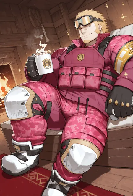 替代服装,护目镜,护目镜戴在头上,粉色夹克,迷彩夹克,粉色长裤,迷彩长裤,黑色手套,黄色臂章,白色护膝,白色靴子,光环,闪耀灵光,脸颊上贴着创可贴
