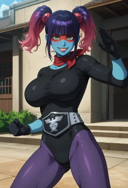 - 쇼커 복장, 빨간 스카프, 불가능한 레오타드, 검은 레오타드, 세미슬리브, 검은 장갑, 검은 벨트, 은색 벨트 버클, 보라색 팬티스타킹, 검은 부츠,