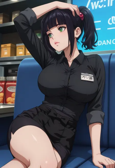 직원 유니폼, 검은 폴로 셔츠, 긴 소매, 소매 말아 올림, 이름표, 검은 앞치마, 허리 앞치마, 검은 연필 스커트, 검은 신발,