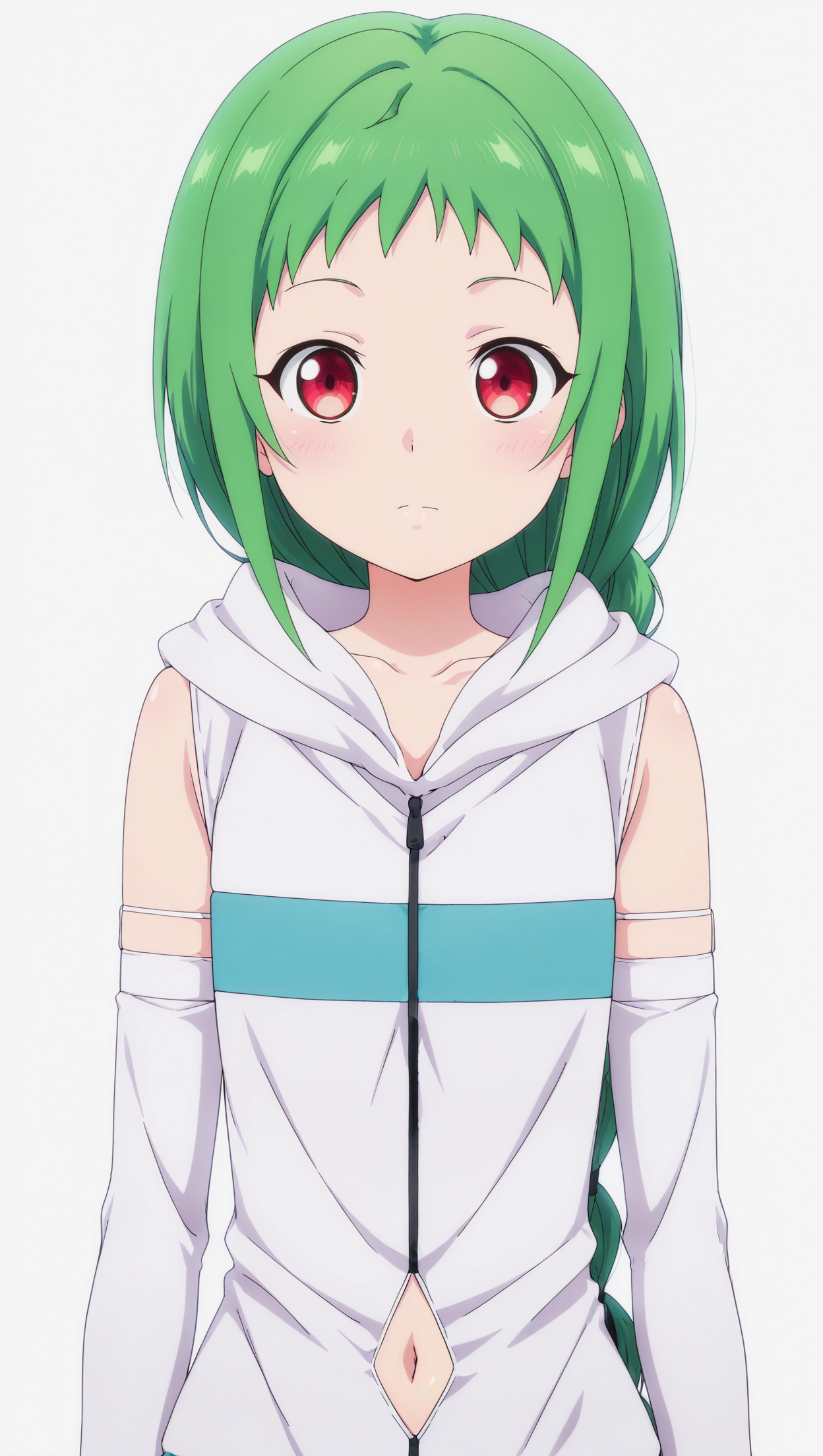 ((anime coloring)), masterpiece, best quality, amazing quality, sui, 1girl, long hair, braid, green hair, red eyes, flat chest, hood, hood down, hoodie, navel cutout, elbow gloves, navel, boots, solo, pose, standing, from front, looking at viewer, (((white background, simple background)))