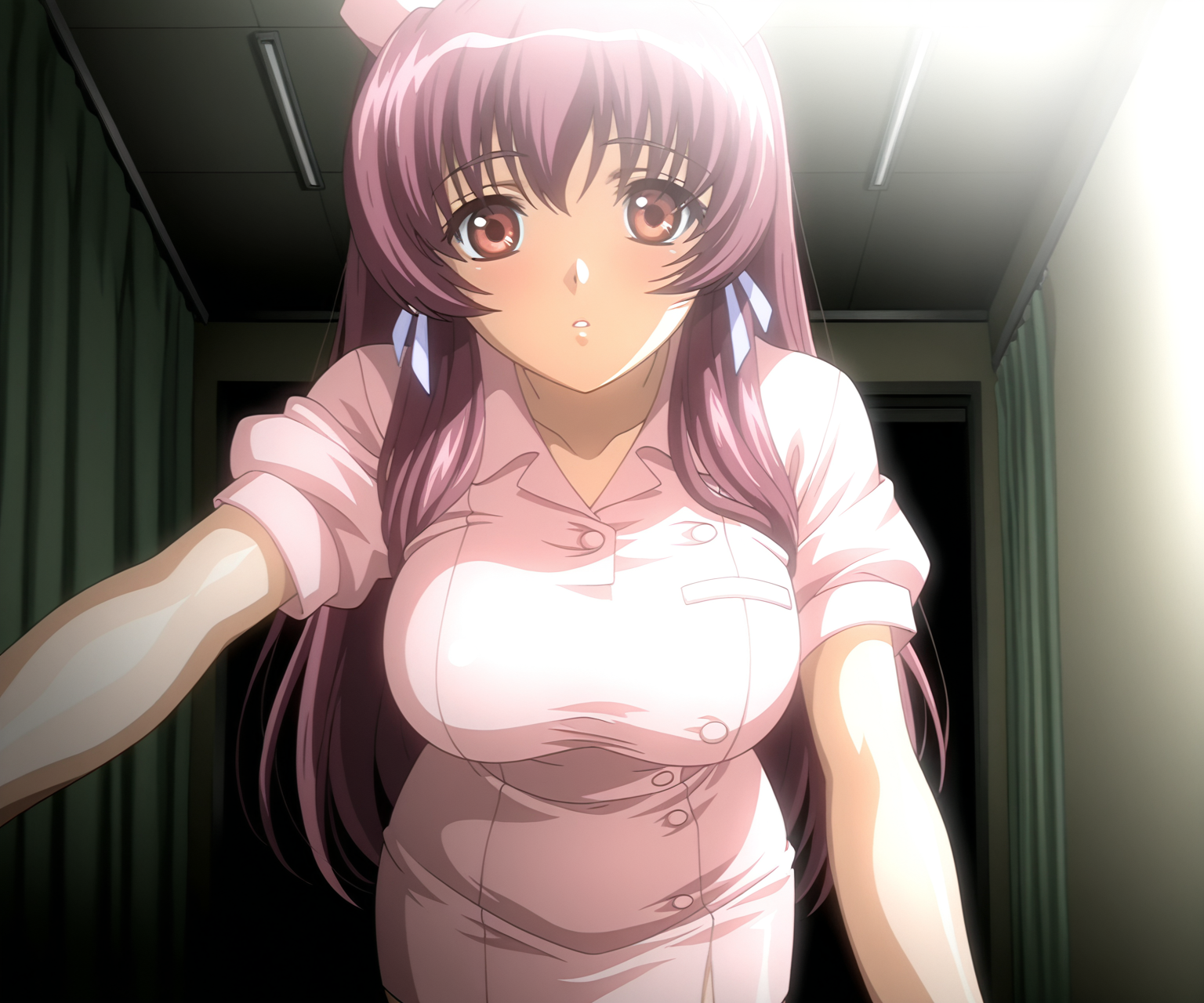 kazama mana, large breasts, pink hair, long hair, hair ribbon, red eyes, pink nurse, nurse cap, shirt, pencil skirt,